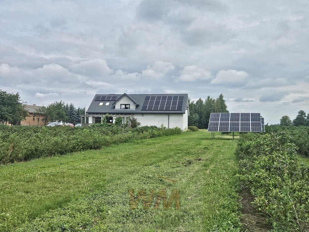 Dom o powierzchni 128,62m2. Na parterze (70,01 m2) znajduje się salon (28,93 m2), gabinet, kuchnia, łazienka, hall i korytarz na piętrze (58,61 m2)- salonik, łazienka i 3 sypialnie. We wspólnej bryle domu znajduje się pomieszczenie chłodni (pojemność ok 150m) i pakowalni owoców (38 m2). Dom i chłodnia wyposażone są w instalację fotowoltaiczną o mocy 20kW, w tym 10kW zainstalowano na dachu i 10kW na gruncie. W domu jest woda, kanalizacja, internet swiatłowód i prąd 230 i 400V.